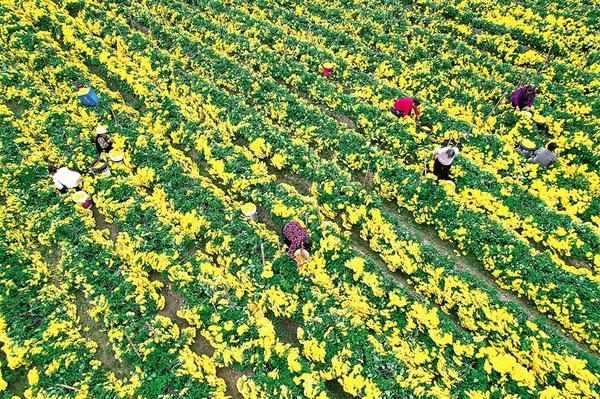 11月13日,項(xiàng)城市新橋鎮(zhèn)南趙村村民在田間采摘金絲皇菊。剛剛離枝的新鮮菊花隨即被送往村里的加工車間烘干,之后由專業(yè)合作社統(tǒng)一收購(gòu)并對(duì)外銷售。